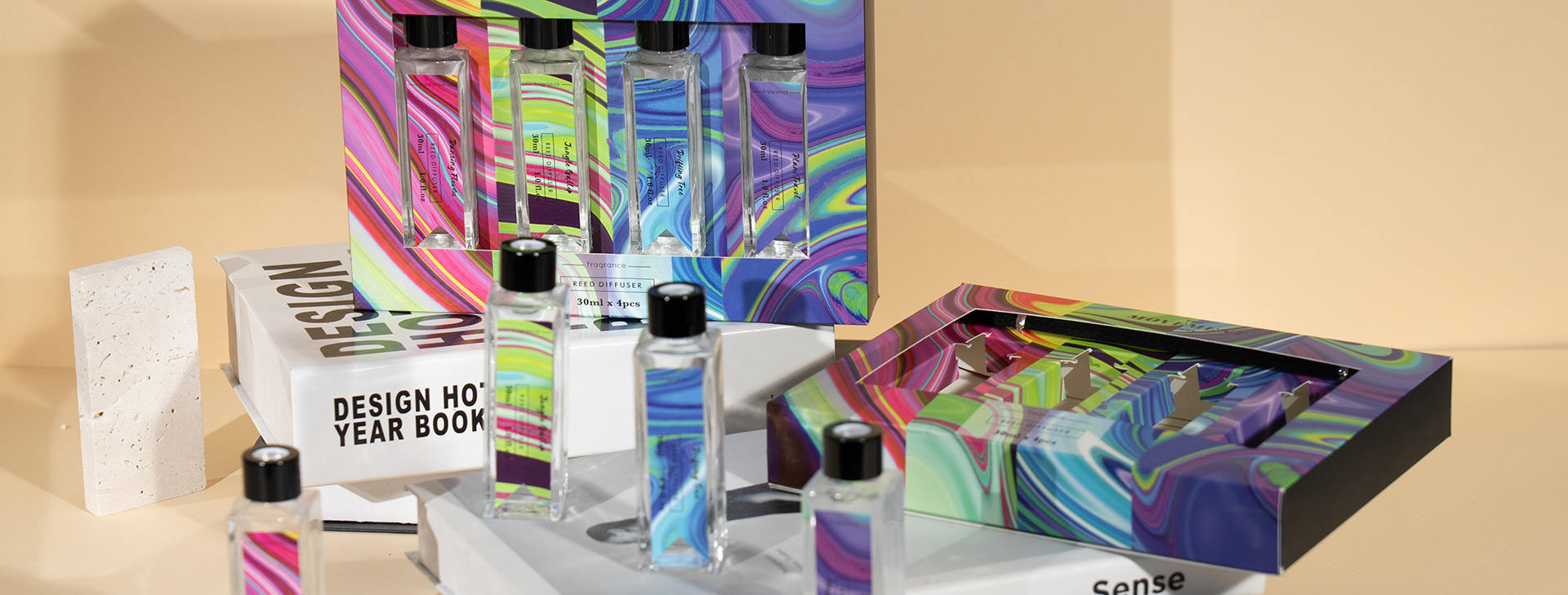 Customized home fragrance with your choice of size, color, packaging, and fragrance—floral, fruity, sandalwood, amber, and more.