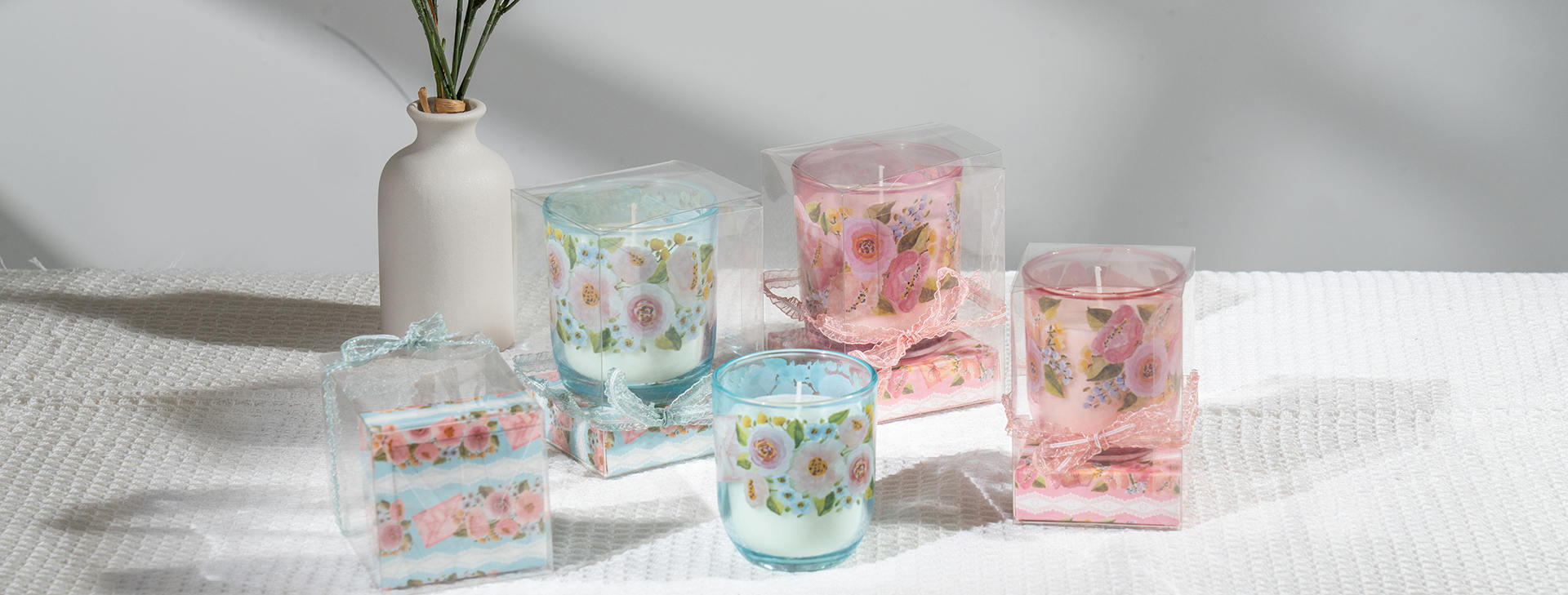 Fully customizable candles: grams, colors, packaging, and scents including florals, fruits, sandalwood, and amber.