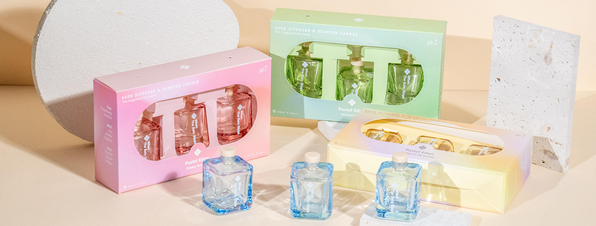 Discover Pastel Eden, where pale pink, blue, and yellow tones quietly echo nature’s calm beauty. This series brings you the lightness of a dreamlike forest and the refreshing breeze after a summer rain.